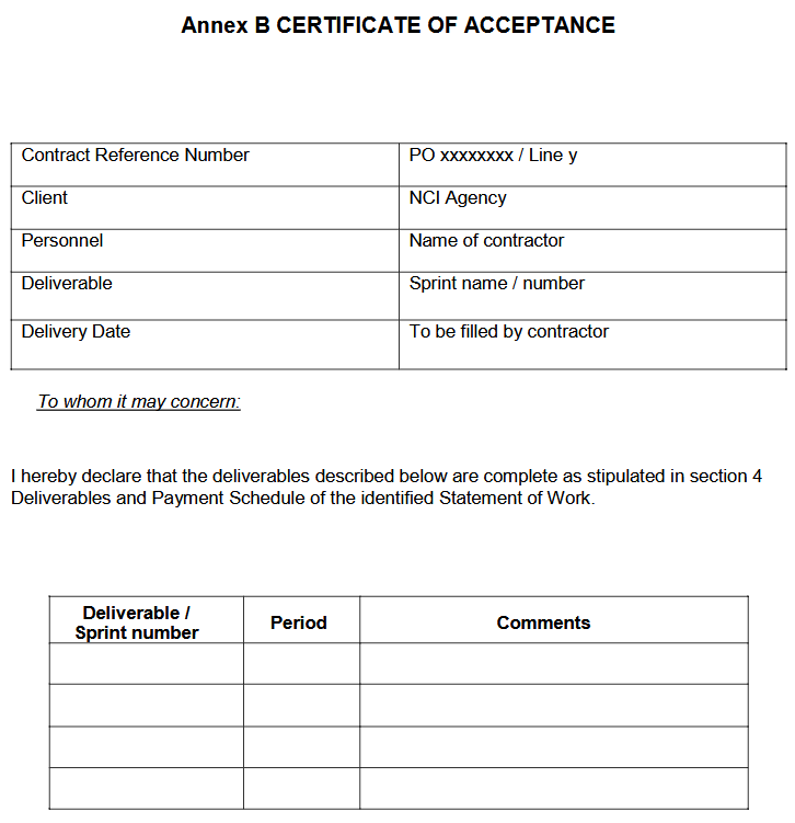 The payment shall be dependent upon successful acceptance as set in the above planning/review meetings. This will follow the payment milestones that shall include a completed Certificate of Acceptance (COA) – See Annex B.